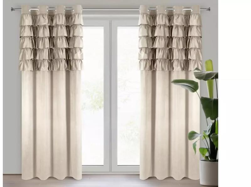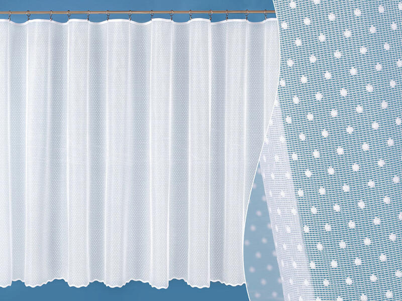 kész dekoratív drapéria, 100 % poliészter, súly 160g/m2, felvarrt univerzális ráncolószalag, szegélye beszabva, csipeszre vagy kampóra rögzíthető.