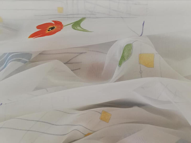 Nyírt mintás (shearly) függöny, amely gyártása során a jacquard beszövéssel készült motívomok fonalszálait körülvágják, így a minták széle különleges, puha tapintású lesz a kelme egyik oldalán. Kétoldalas fényáteresztő függöny.