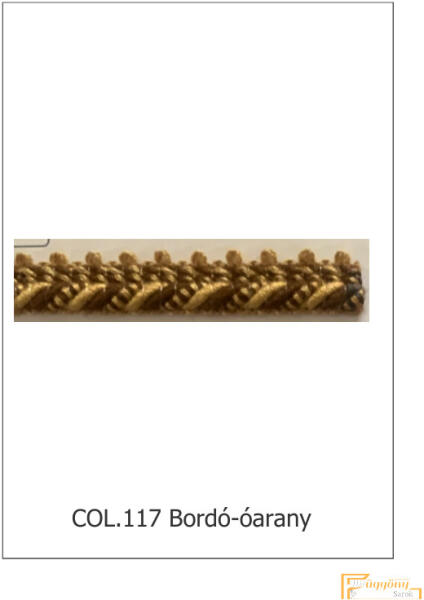 ◤ Kategória: Függöny zsinór ◤ Méret: 15 mm ◤ Szín: Bordó-óarany ◤ Anyagösszetétel: 70% Acetát 30% Viszkóz A megjelölt ár 1 méterre vonatkozik! Legkisebb rendelhető mennyiség: 5 méter Kategória: Függöny zsinór Szín: Bordó-óarany Anyagösszetétel: 70% Acetát 30% Viszkóz Legkisebb rendelhető mennyiség: 5 méter 50 méter/tekercs Zsinóros bortni, ami 15 mm széle