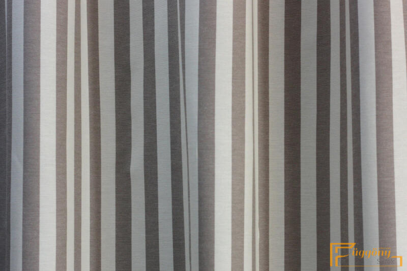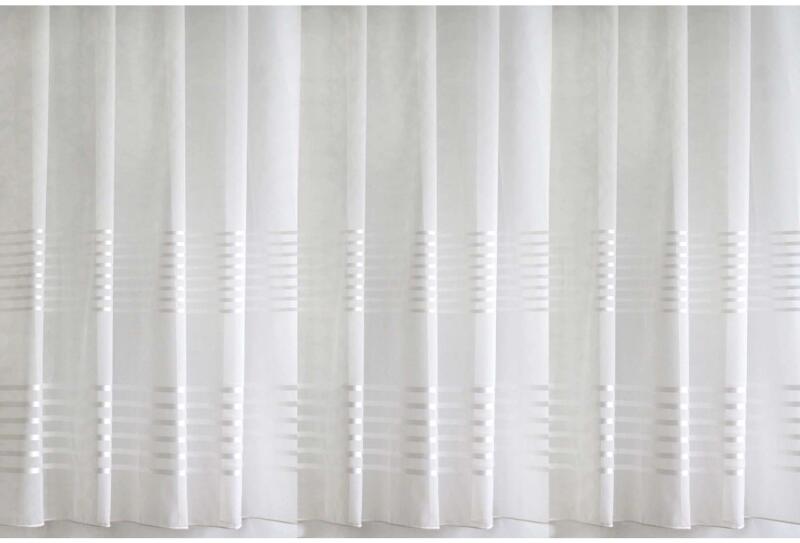 Fényáteresztő függöny, fehér alapon alján több sorban fehér keresztben csíkos, ólomzsinóros. Összetétele poliészter. A függönyt az áruházban az Ön által kívánt méretre vágják.