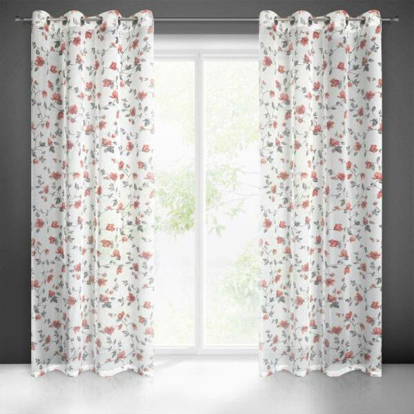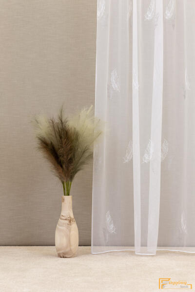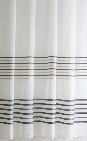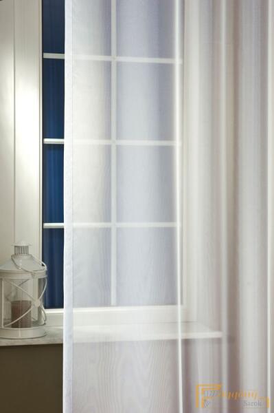 100%polieszter, 200cm magas, 290cm széles, tetején ráncolóval, mellyel a kívánt méretre behúzható, alján ólommal, törtfehér árnyalat, alján 2 sor szatén csíkos bordűr