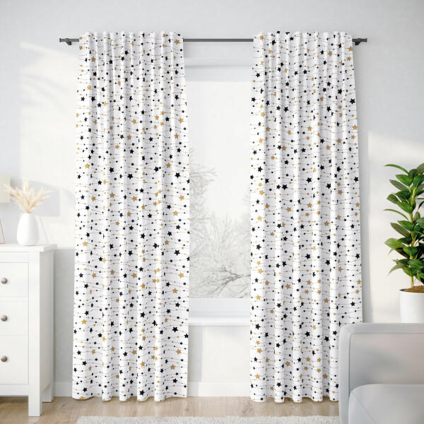 pamut drapéria, felvarrt univerzális ráncolószalag, szegélye beszabva, 100 % pamutszövet, súly 145g/m2, csipeszre vagy kampóra rögzíthető.