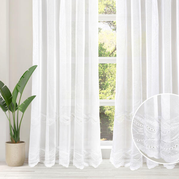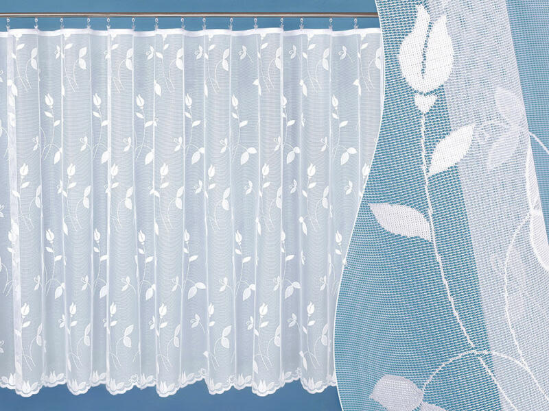 Fehér színű hímzett, bordűrös vitrázs, összetétele poliészter. A függönyt az áruházban az Ön által kívánt méretre vágják.