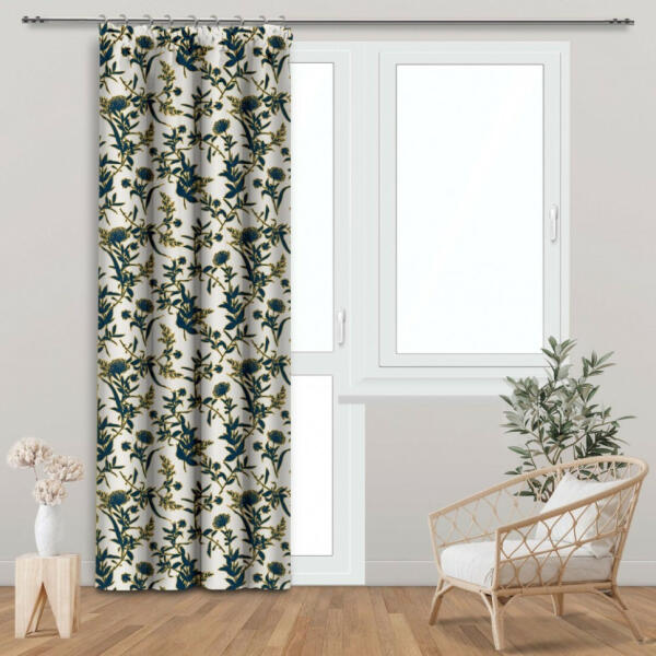 pamut drapéria, felvarrt univerzális ráncolószalag, szegélye beszabva, 100 % pamutszövet, súly 145g/m2, csipeszre vagy kampóra rögzíthető.
