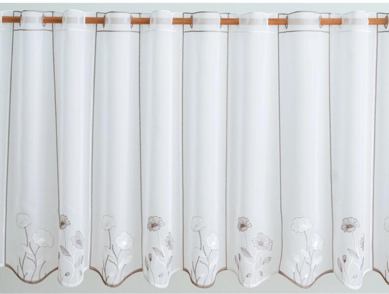 Fehér alapon barna hímzett virágos vitrage függöny vágócsíkkal és lyuksorral, 90 cm magas, összetétele 100% poliészter
