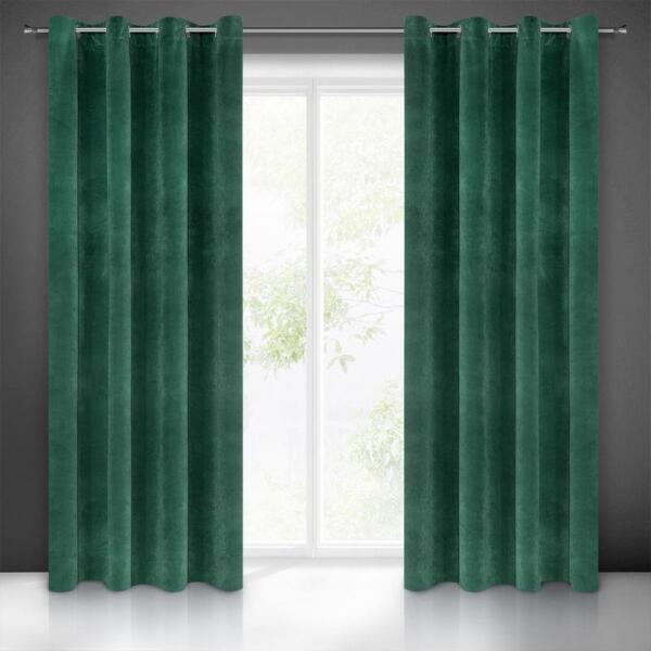 Bársony sötétítő függöny 10 db ringlivel, szélesség: 140 cm, hossz: 250 cm, színe: sötétzöld. Grammsúly: 290 GSM. Összetétel: 100% poliészter