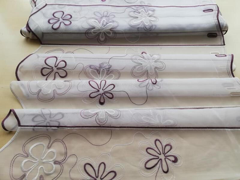 kész dekoratív drapéria, 100 % poliészter, súly 160g/m2, felvarrt univerzális ráncolószalag, szegélye beszabva, csipeszre vagy kampóra rögzíthető.