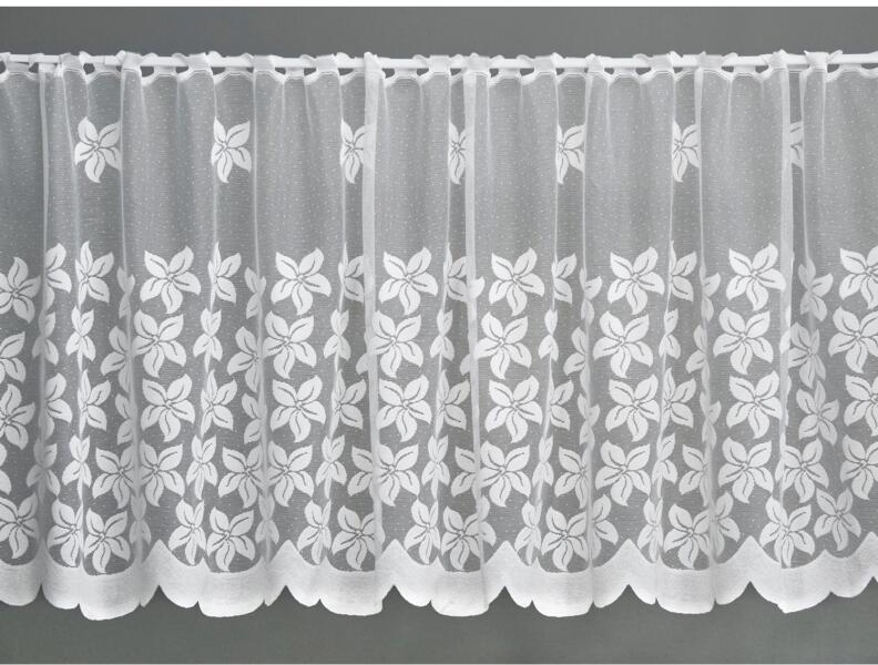 Fehér színű, virágmintás, bordűrös jacquard vitrázs, amely szín- és mintavilágával természetközeli és kellemes hangulatot varázsol az otthonába. Az egyszerűségének köszönhetően bármilyen színű sötétítőfüggönnyel jól mutat. Kezelése egyszerű, nem igényel vasalást. Összetétele poliészter.