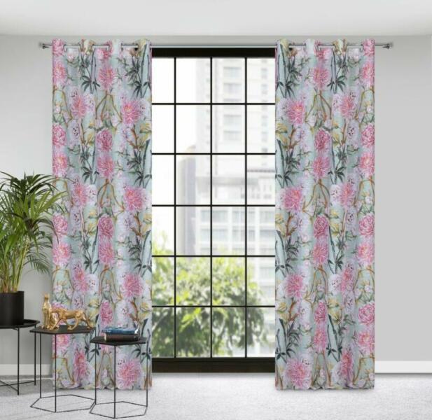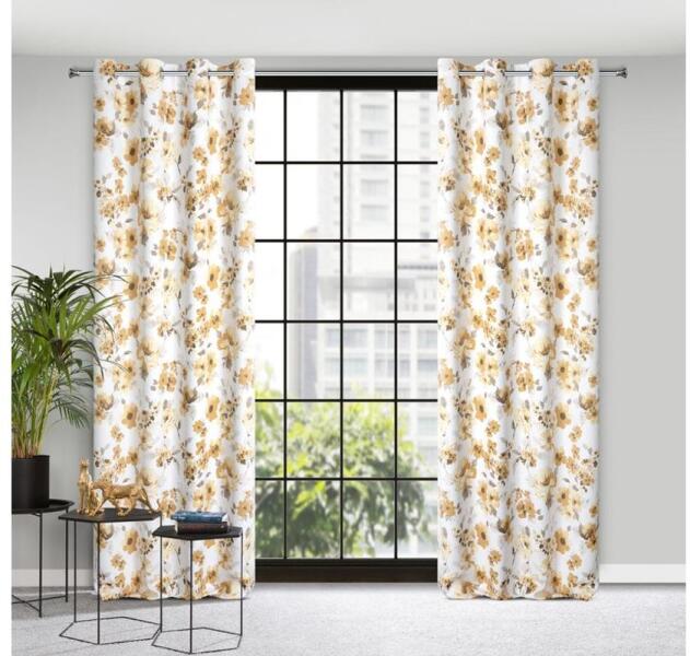 Termék részleteksötétítő függöny nyomtatott virágmintával, szélesség: 140 cm, hossz: 250 cm, színe: fehér/bézs. Grammsúly: 210 GSM. Összetétel: 100% poliészter
