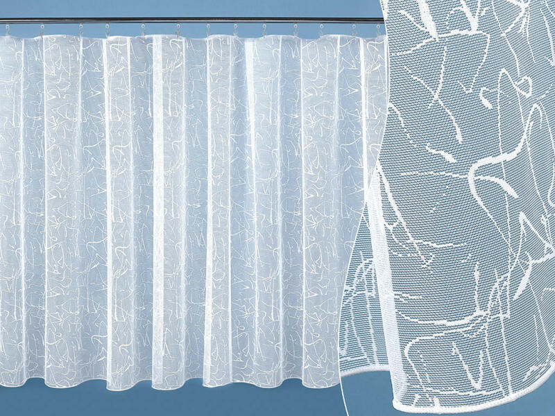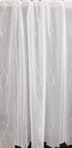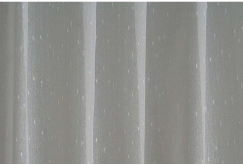 Termék részletekFehér fényáteresztő függöny apró beszövésekkel. Ólomzsinóros, összetétele poliészter. A függönyt az áruházban az Ön által kívánt méretre vágják.