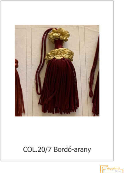 Termék részletek◤ Kategória: Paszományok ◤ Mérete: 9 cm ◤Zsinór vastagsága: 2 mm ◤ Szín: Bordó-arany ◤ Anyagösszetétel: 90% acetát, 10% polipropilen Kategória: Paszományok Szín: Bordó-arany Anyagösszetétel: 90% acetát, 10% polipropilen Minimum rendelhető mennyiség: 5db A teljes magasság: 9 cm, a csüngő rész magassága: 7 cm a záró kalap magassága: 2 cm, akasztó zsinór hossza: