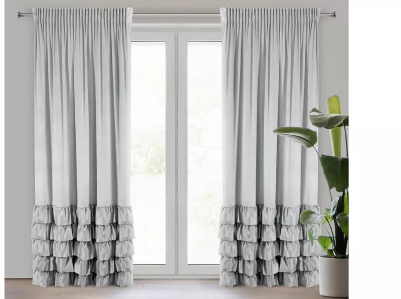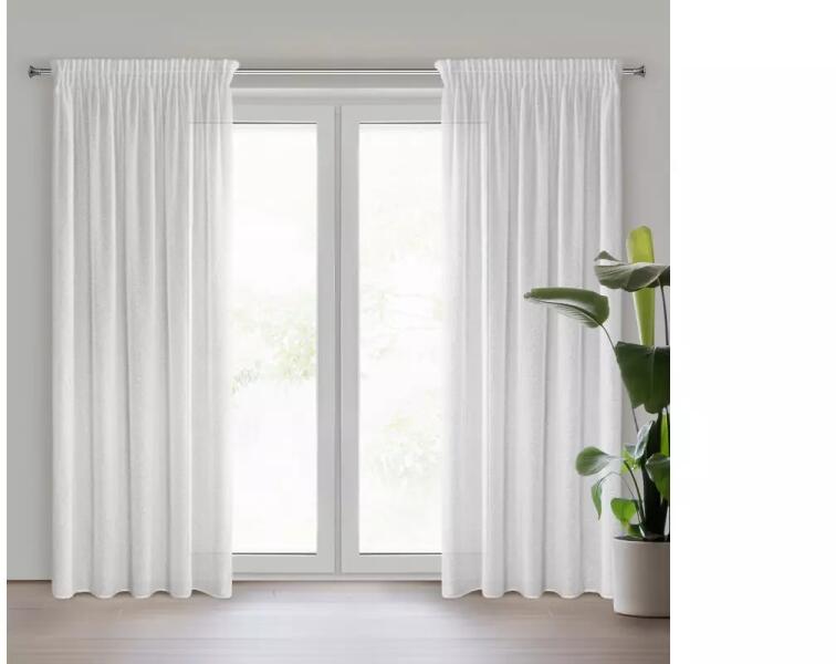 dekoratív drapéria LONETA, Spanyol szövetből varrva, súly 190g/m2, felvarrt univerzális ráncolószalag, szegélye beszabva, csipeszre vagy kampóra rögzíthető.