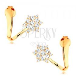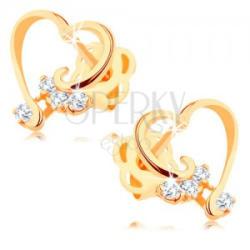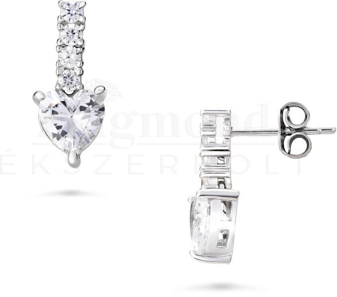 A gyémánt fülbevaló 585 sárga aranyból szív körvonalú fényes és sima felülettel. A körvonal egyik oldalt megszakad, és mindkét vége enyhén megtekeredik. A szétválasztott vonalakat négy átlátszó gyémánt díszíti - három kisebb és egy nagyobb. Biztonságos viselését stekker teszi lehetővé. Fülbevaló méretei: 7 x 8 mmA kisebb gyémántok átmérője: 1,2 mmA nagyobb