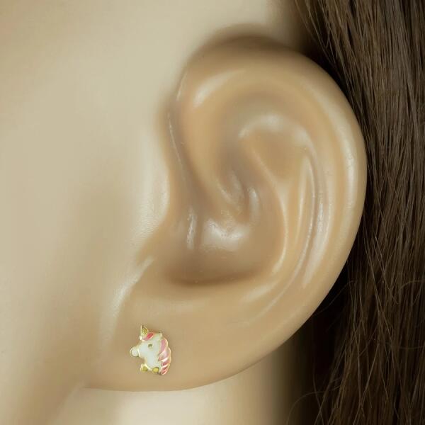 A 9K sárga arany fülbevaló egyszarvú formájú, fényes fehér mázzal borítva. A külső vonalak, a szem és a szarv arany kivitelben. Az egyszarvúnak rózsaszín sörénye és sárga masnis nyakkendő van a nyakán. A fülbevaló stekkerzárral rendelkezik. A fülbevaló méretei: 5 x 7 mm A fülbevaló súlya: 0,35 g Fémjelzés – van. Az ár egy párra vonatkozik