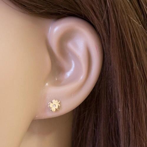 A gyémánt fülbevaló 14K sárga aranyból négylevelű lóhere alakú, amelynek felülete fényes és a közepébe egy csiszolt átlátszó gyémánt van beültetve. Biztonságos viselését stekker teszi lehetővé. Fülbevaló méretei: 5 x 6 mmEgy gyémánt átmérője: 1 mmGyémántok súlya: 0,012 ctTisztaság: SI1Szín: HFülbevaló súlya: 0,53 gFémjelzéssel ellátott. Az ár egy párr