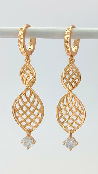 Aranyszínű karika fülbevaló, melyet áttört mintás függő díszít és fehér cirkónia kristály tesz csillogóvá. A kristály karmos foglalatban helyezkedik el. Tartós ékszer, fürdéskor nem kell levenni, nem feketedik ("gold filled"). Antiallergén ékszer. 18K arany színben kapható. Fülbevaló teljes hossza: 42 mm. Karika rész belső átmérője: 8 mm. Függő szélessége: 11 m