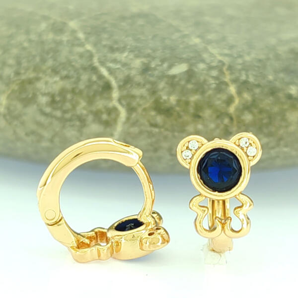 Aranyszínű karika fülbevaló, melyet királykék és fehér cirkónia kristály tesz csillogóvá és macika motívum díszít. A kristályok karmos, ragasztott, peremezett foglalatban helyezkednek el. Időtálló darab, nem kopik, nem feketedik, nem színezi a bőrt. Antiallergén ékszer, nem okoz panaszokat fémérzékeny hölgyeknek sem. 18K arany színben kapható. Fülbevaló szélessége