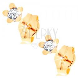 Beszúrós fülbevaló 14K sárga aranyból apró virág alakban sima és fényes felszínnel. A virág közepébe csillogó kis átlátszó cirkónia van beültetve. A fülbevaló kapcsolása stekkeres. A fülbevaló mérete: 4 x 4 mmSúly: 0,3 gFémjelzéssel ellátott. Az ár egy párra vonatkozik.