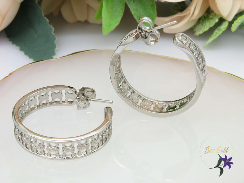 Antiallergén bedugós karika fülbevaló Szin: rodium (ezüst szín) Méret: 25x7mm Bedugós : szár 10 mm A forgalmazott divatékszerek alapanyaga nikkel és ólommentes ezért többnyire nem okoznak allergiás tüneteket, nyugodtan hordhatják fémérzékeny emberek is. Általában nem színezik a bőrt és más divatékszerekhez képest nagyságrendekkel jobb kopásállósággal rendelkeznek.