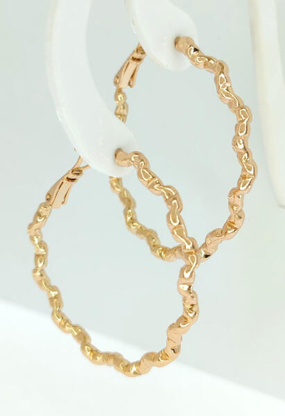 Aranyszínű csavart karika fülbevaló. Időtálló darab, nem kopik, nem feketedik, nem színezi a bőrt. Antiallergén ékszer, nem okoz panaszokat fémérzékeny hölgyeknek sem. 18K arany színben kapható. Fülbevaló szélessége: 4 mm. Karika belső átmérője: 36 mm. Az antiallergén ékszerek olyan fémötvözetből készülnek, melyek nem irritálják a bőrt, nem okoznak allergiás re