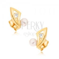 Fülbevaló 9K sárga aranyból, fényes, sima karom alakban, egy kisebb kivágással középen, amelybe egy apró, átlátszó cirkónia van ültetve. A karom csúcsa mellett egy golyó formájú, fehér gyöngy helyezkedik el. A hátsó oldal üreges. Biztonságos viselését stekker biztosítja. A fülbevaló méretei: 5 x 9 mmA fülbevaló súlya: 0,4 gFémjelzéssel ellátott. Az ár egy pár