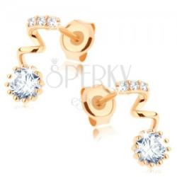 Fülbevaló 14K sárga aranyból spirállal beültetett kövekkel a felső részben, amely alatt egy csiszolt, kerek, átlátszó cirkónia található. A nagyobb cirkónia foglalatba van ültete és karmokkal megfogva, amelyek a cirkónia körül egy dísz keretet alkotnak. A fülbevaló biztonságos viselését stekker biztosítja. A fülbevaló méretei: 4 x 9 mmA fülbevaló súlya: 0,7 gFémj
