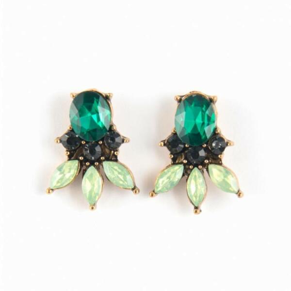 Bedugós fülbevaló, zöld és fekete kövekkel kirakva. Mérete: kb. 2,5 cm x 1,8 cm