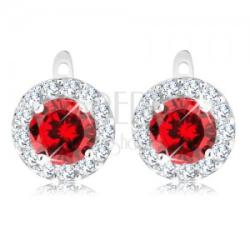 925 ezüst fülbevaló kerek alakban. A közepébe kerek csiszolt cirkónia található piros árnyalatban, mely teljes kerülete csillogó csiszolt apró átlátszó cirkóniákkal van kirakva. A fülbevaló kapcsolása orosz patent. A fülbevaló mérete: 9 x 9 mmSúly: 3,1 gFémjelzéssel ellátott. Az ár egy párra vonatkozik.