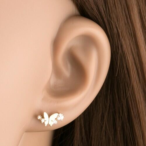 Fülbevaló 9K sárga aranyból kicsi pillangó alakban fényes, sima felülettel. A pillangó rövid ágon ül, amely négy, átlátszó, cirkóniából tevődik össze, félhold alakra rendezve nagyság szerint. Biztonságos viselését stekker biztosítja. A fülbevaló méretei: 12 x 6 mmA fülbevaló súlya: 0,78 gFémjelzéssel ellátott. Az ár egy párra vonatkozik.