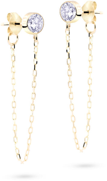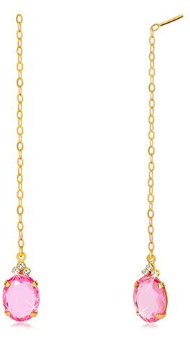 A fülbevaló 375 sárga aranyból készült. Fényes láncon rózsaszín lapos, ovális formára csiszolt cirkonkő függ, amely felső részét három kristálytiszta cirkónia díszíti. A lánc átfűző pálcával végződik. Akasztós kivitel - a fülbevalót át kell szúri a lyukon, és szabadon lóg. A díszes rész méretei: 6 x 12 mmA fülbevaló teljes hossza (az átfűző pálcával e