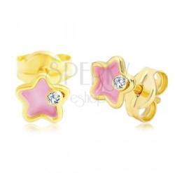 A 14K sárga arany fülbevaló kicsi virág alakú, amelynek közepét fényes rózsaszín fénymáz tölti ki. A felső részben egy apró átlátszó cirkónia van beültetve. Biztonságos viselését stekker teszi lehetővé. Fülbevaló méretei: 5 x 5 mmFülbevaló súlya: 0,3 gFémjelzéssel ellátott. Az ár egy párra vonatkozik.