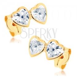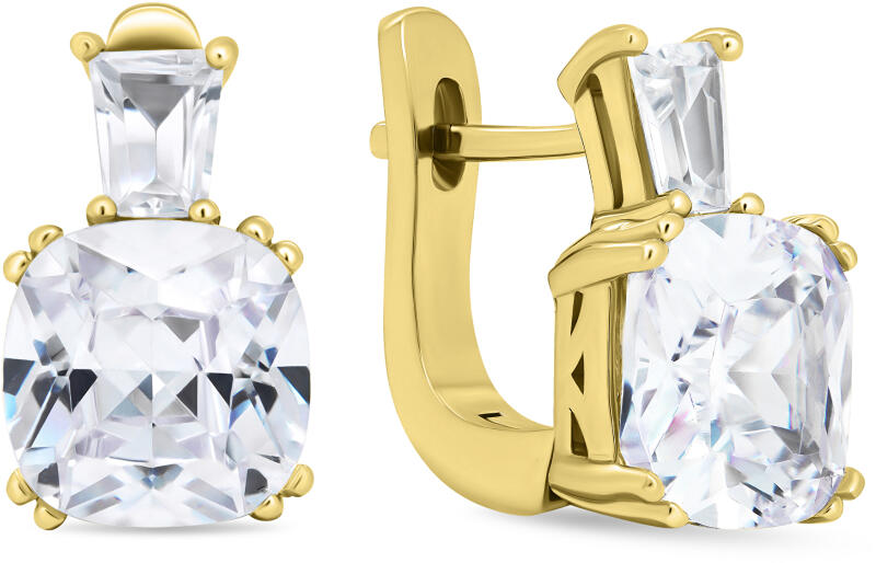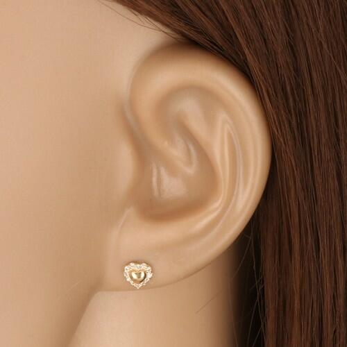Fülbevaló 9K sárga aranyból csillogó, átlátszó cirkóniákkal, egyenletes szív alakra csiszolva. A szívecskék ferde vonalba vannak egymás mellé helyezve és fényes foglalatokba ültetve. Biztosnágos viselését stekker biztosítja. A fülbevaló méretei: 8 x 6 mmA fülbevaló súlya: 0,5 gFémjelzéssel ellátott. Az ár egy párra vonatkozik.