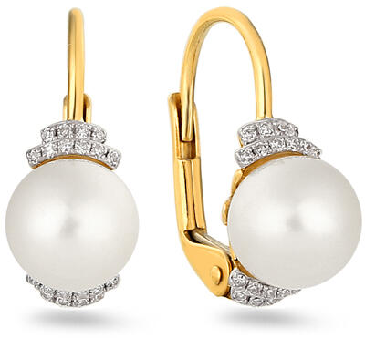 Arany fülbevalók édesvízi Biwa gyöngyökkel díszítve, 7 mm átmérővel. A női szabadalom finom vonalai sárga aranyból készülnek, amelyben egy gyöngy van elhelyezve, amelyet felül és alul tiszta gyémánt díszít.