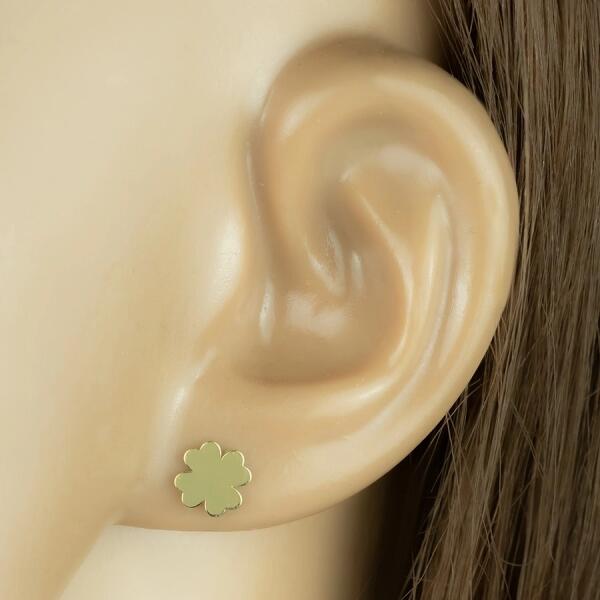 A 14K sárga aranyból készült fülbevalók ívesen ívelt „lucky felirattal és négylevelű, faragott levelekkel ellátott lóhere formájában kaphatók. A fülbevaló sima és tükörfényes felületű. A fülbevaló stekkerzárral rendelkezik. Felirat méretei: 11,5 x 5 mm Négylevelű lóhere méretei: 7 x 7 mm A fülbevaló súlya: 0,44 g Fémjelzés – van. Az ár egy párra vonatkozi