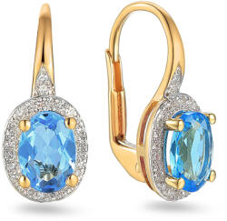 Az elegáns stílusú gyémánt fülbevaló sárga aranyból készült. A korona egy központi topáz drágakőből áll, amelynek összsúlya 2,240 ct. A követ 52 briliáns csiszolású gyémánt veszi körül, amelyek összsúlya 0,130 ct, színük H, tisztaságuk SI1. A női pattintós rögzítés biztosítja, hogy a fülbevaló biztonságosan a helyén marad, így nem kell aggódnia, hogy kie