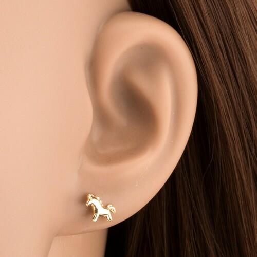 Fülbevaló 14K sárga aranyból egy ügető ló formájában, enyhén bemetszett részletekkel. A ló felülete fényes, sima és enyhén kidomborodó. Stekkeres kapcsolás. Fülbevaló méretei: 8 x 6 mmFülbevaló súlya: 0,30 gFémjelzéssel ellátott. Az ár egy párra vonatkozik.
