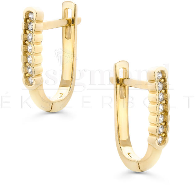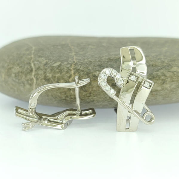 Ezüstszínű fülbevaló, melyet fehér cirkónia kristályok tesznek csillogóvá és gémkapocs motívum díszít. A kristályok karmos foglalatban helyezkednek el. Időtálló darab, nem kopik, nem feketedik, nem színezi a bőrt. Antiallergén ékszer, nem okoz panaszokat fémérzékeny hölgyeknek sem. Fülbevaló szélessége: 13 mm. Kapcsos rész belső hossza: 10 mm. Fülbevaló teljes ho