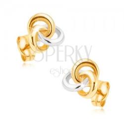 Bedugós 375 arany fülbevaló, ródiummal kezelt felülettel, három, fényes, lekerekített, sima karikából, miközben az egyik fehér a másik kettő sárga aranyból készült. A gyűrűk egymással össze vannak kapcsolva és ezáltal csomóra emlékeztetnek. Biztonságos viselését stekker biztosítja. A fülbevaló méretei: 7 x 7 mmA fülbevaló súlya: 0,51 gFémjelzéssel ellátott. A