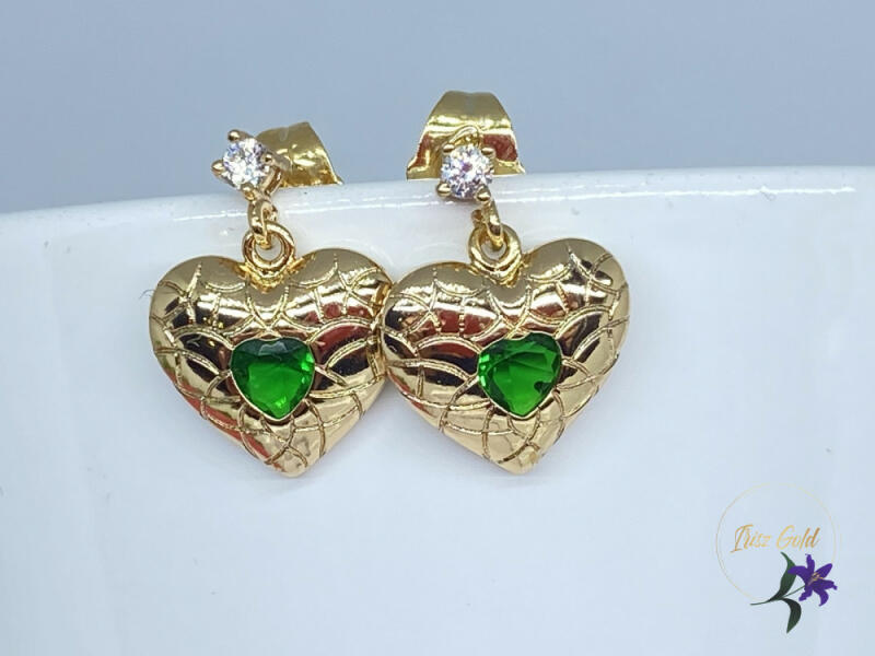 Szív alakban zöld kőves beszúrós fülbevaló Szin: 18K Méret: 15x10mm A forgalmazott divatékszerek alapanyaga nikkel és ólommentes ezért többnyire nem okoznak allergiás tüneteket, nyugodtan hordhatják fémérzékeny emberek is. Általában nem színezik a bőrt és más divatékszerekhez képest nagyságrendekkel jobb kopásállósággal rendelkeznek. A fehér (ezüst) színű éksze