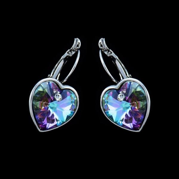 Cikkszám: 0027 Akasztós, kapcsos fülbevaló: - platina bevonattal, - színjátszó lila Swarovski kristályokkal. Hossza: 2,8 cm. A kristály mérete: 1,6 cm x 1,6 cm. Súlya: 12 g / pár. Gyönyörű, exkluzív, Swarovski kristályos ékszer. A megadott méreteket kérjük vegyék figyelembe!
