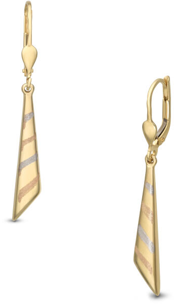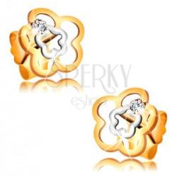 14K arany fülbevaló, virág alakban, kettős körvonallal. A kisebb korvonala fehér arany, a szélső sárga arany változat. A felső részen egy apró cirkónia helyezkedik el. Biztonságos viselését stekker teszi lehetővé. Méret: 8 x 8 mmSúly: 0,5 gFémjelzéssel ellátott. Az ár egy párra vonatkozik.