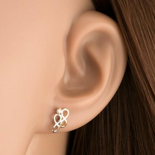 Fülbevaló 9K aranyból két végtelen szimbólummal - felvő nyolcas. Az egyik fele sárga aranyból készült és a másik fehér arany. A fülbevaló átlátszó kerek cirkóniával díszített mely foglalatba van ültetve. A fülbevaló kapcsolása stekkeres. Fülbevaló mérete: 10 x 6 mmFülbevaló súlya: 0,56 gFémjelzéssel ellátott. Az ár egy párra vonatkozik. A ródiummal kezelt fel