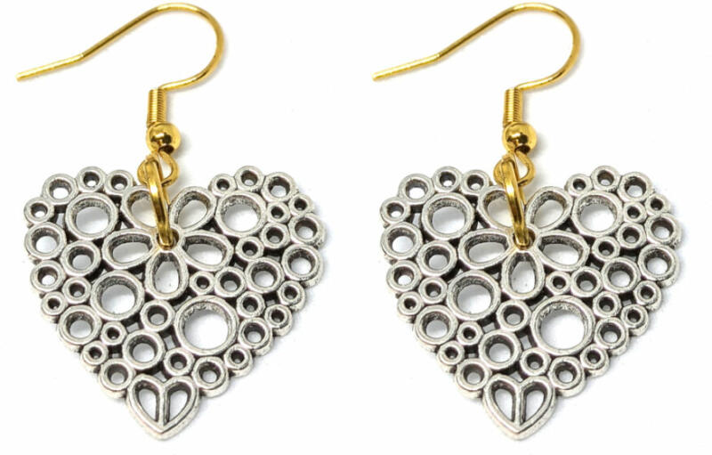 Virágos szív fülbevaló. Para méterek: A függő mérete 2,5x2,3 cm. A színe ezüst, anyaga fémötvöze t. Akasztó rozsdamentes acélból készült.