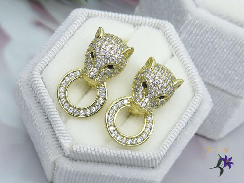 Gold Filled puma fejes fülbevaló szájában karikával Szépen kidolgozott apró tűcirkónia kövek díszítik Nagyon szép egzotikus ékszer Szin: 14K Méret: 22x12mm Zar franciakapocs : mélysége 10 mm A forgalmazott divatékszerek alapanyaga nikkel és ólommentes ezért többnyire nem okoznak allergiás tüneteket, nyugodtan hordhatják fémérzékeny emberek is. Általában nem színezik