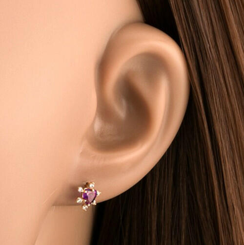 Csillogó fülbevaló 9K sárga aranyból egyenletes ametiszt szívvel lila árnyalatban, amelyet csillogó kiemelkedések kereteznek apró, átlátszó, kerek cirkóniákkal. Biztonságos viselését stekker biztosítja. A fülbevaló méretei: 7 x 8 mmA fülbevaló súlya: 0,49 gFémjelzéssel ellátott. Az ár egy párra vonatkozik.