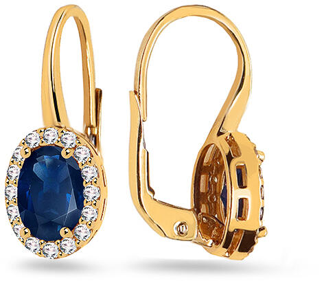 Egyedi női fülbevaló sárga aranyból. A fülbevalót ovális, sötétkék zafír díszíti négyszeres beállításban, melyet a kisebb átlátszó cirkóniákból álló ligot emel ki.