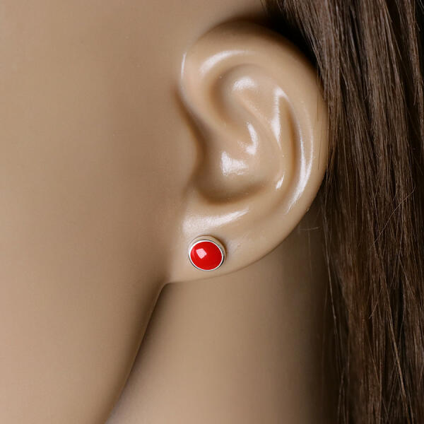 925 Ezüst fülbevaló kerek kerettel, belül kerek alakú domború mázzal piros színben. A fülbevaló stekker zárral rendelkezik. Fülbevaló átmérő: 6 mmFülbevalók súlya: 1,22 gFémjel- van Az ár egy párra értendő.