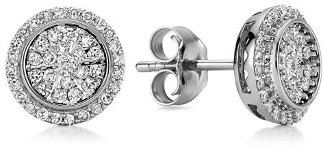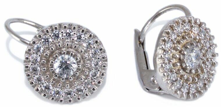 Modern stílusú, kedvelt fazonú, ródiummal bevont, cirkónia kővel ékített, kör fehérarany fülbevaló.