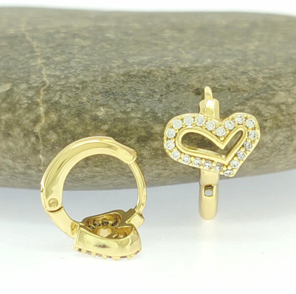 Aranysárga színű karika fülbevaló, melyet szív minta díszít és fehér cirkónia kristályok tesznek csillogóvá. A kristály karmos foglalatban helyezkedik el. Időtálló darab, nem kopik, nem feketedik, nem színezi a bőrt. Antiallergén ékszer, nem okoz panaszokat fémérzékeny hölgyeknek sem. 14K arany színben kapható. Fülbevaló szélessége: 10 mm. Karika belső átmérője: