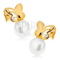 Bedugós fülbevaló sárga 9K aranyból pillangó alakban, az alsó részén egy fehér gyönggyel. A pillangó egyik szárnyát dekoratív kivágás díszíti, melyben egy tiszta kerek cirkónia fekszik. A másik szárny sima és tükörfényes. A hátlap üreges. Biztonságos viselését a stekker biztosítja. A fülbevaló méretei: 8 x 14 mmA gyöngy átmérője: 7 mmA fülbevaló súlya: 1,4